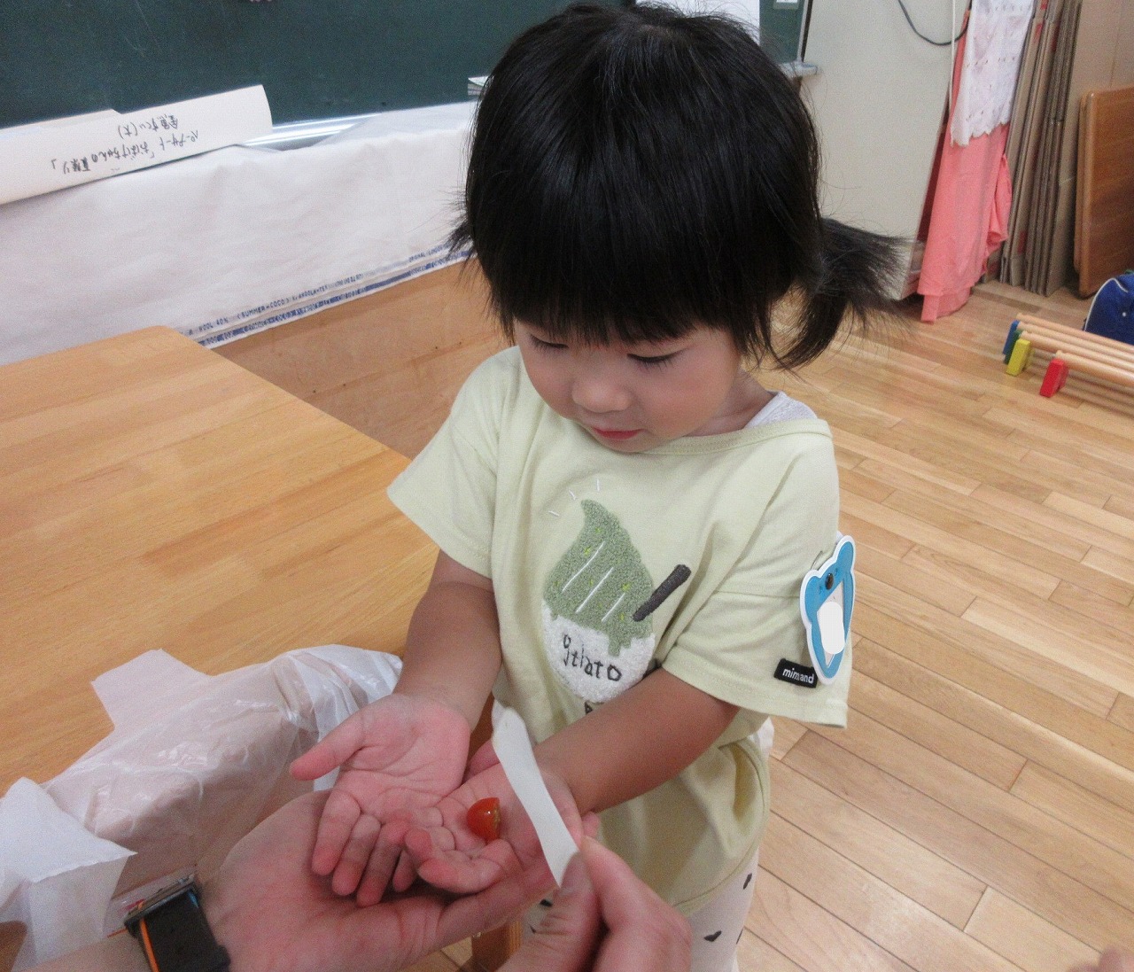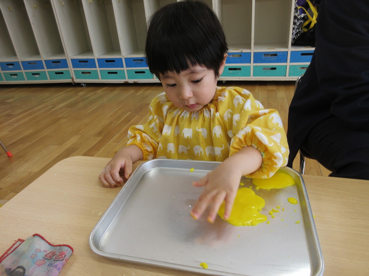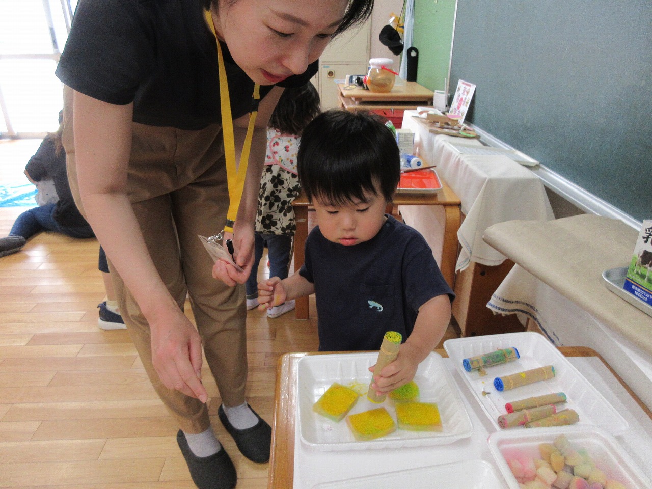 『ま~ぜまぜ♪ま~ぜまぜ♪』と2色の絵の具を混ぜて色がどんどん変わっていく様子を不思議そうに見る子どもたちの目はとても輝いていました☆