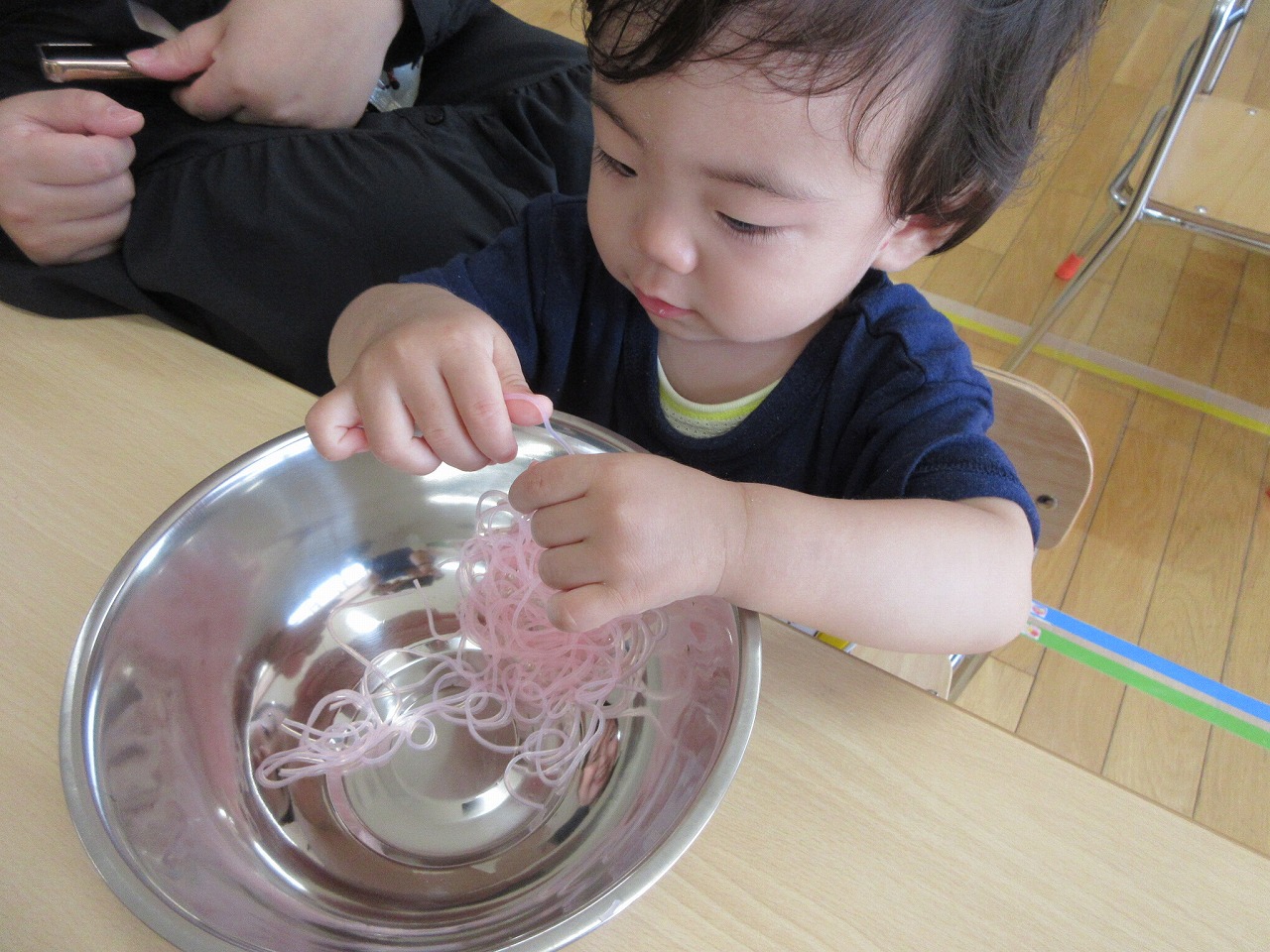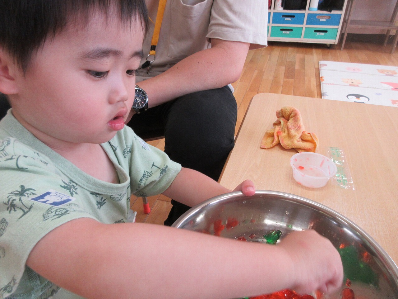 食紅で色付けした春雨や寒天ゼリー、片栗粉スライムなど。掌や足裏で不思議な感触を楽しむ子どもたち。お家でも揃えられる材料ばかりなので、是非やってみてくださいね!