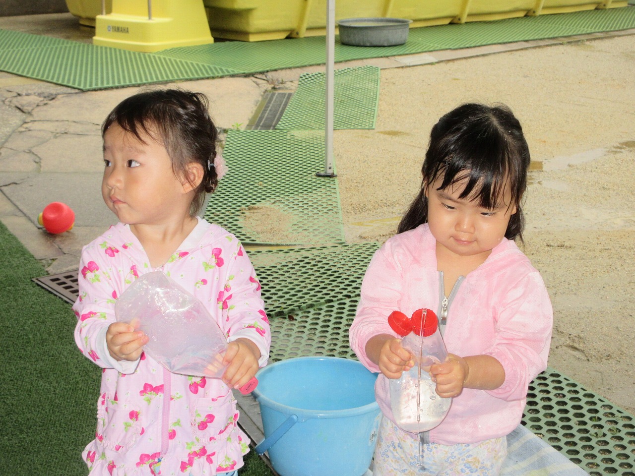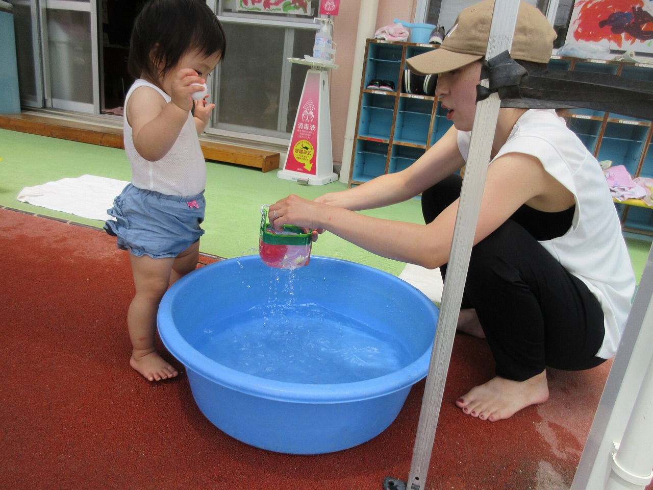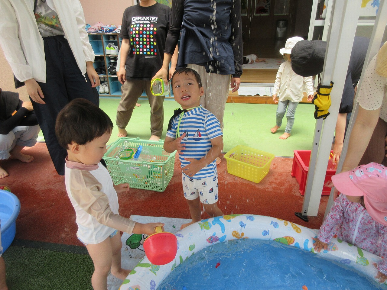 子どもたちが大好きな水遊び。中には水が苦手で泣く子もいましたが、色々なおもちゃに惹かれて気づいたら水遊びに夢中になる子もいますね(^-^)