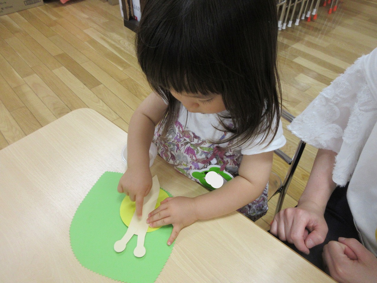 自分で色や材料を選び、マーカーやシール・のりを使って年齢に合った方法で季節の製作を親子で楽しんでいます。