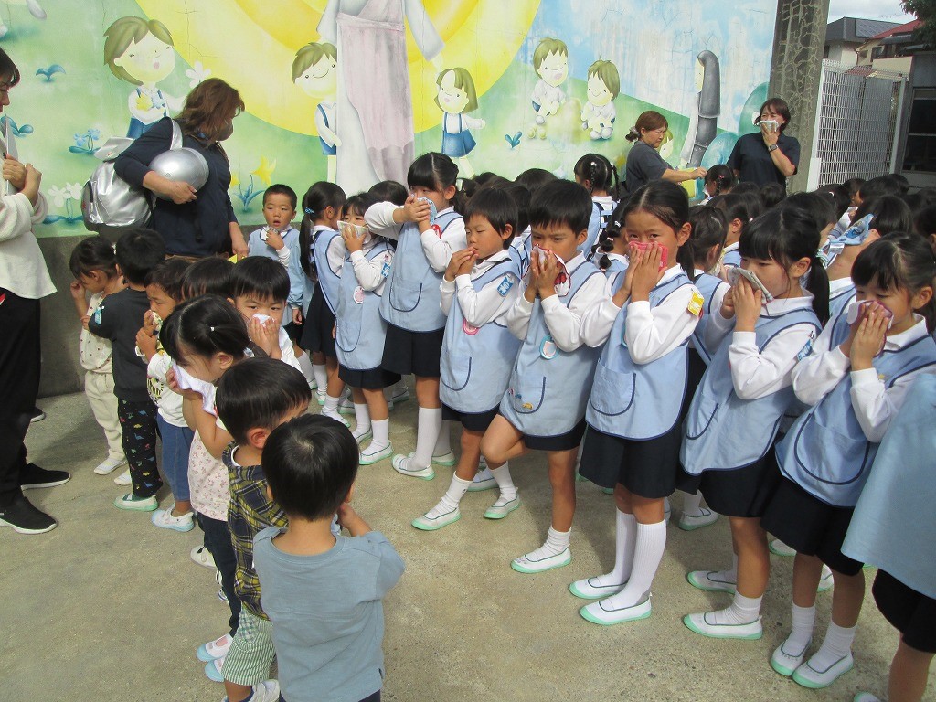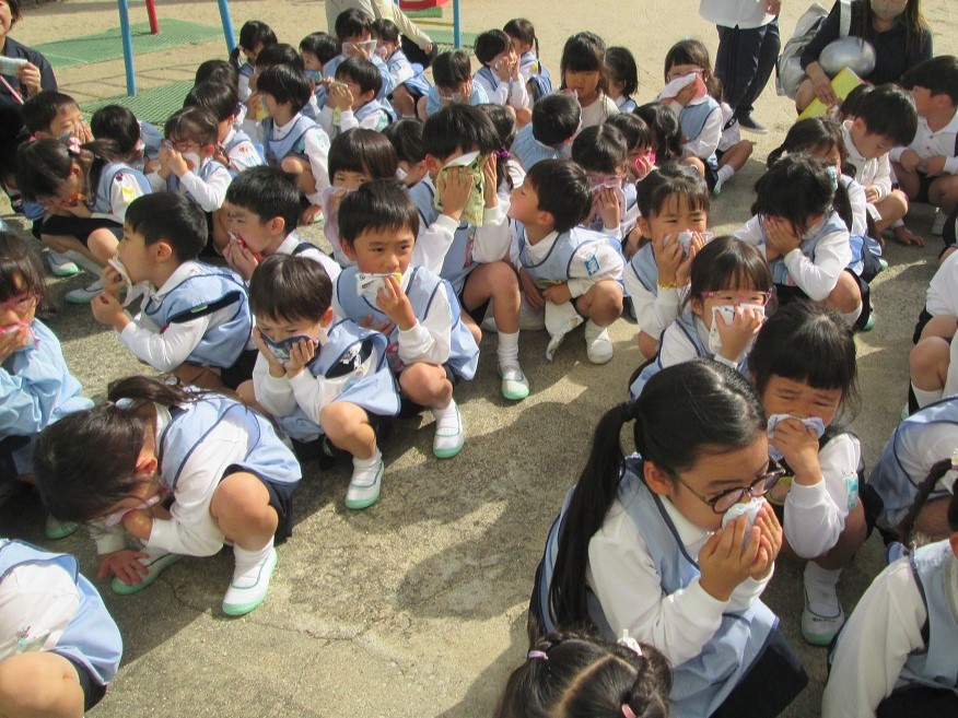 ハンカチで鼻と口をしかっり塞ぐこと!