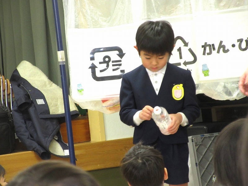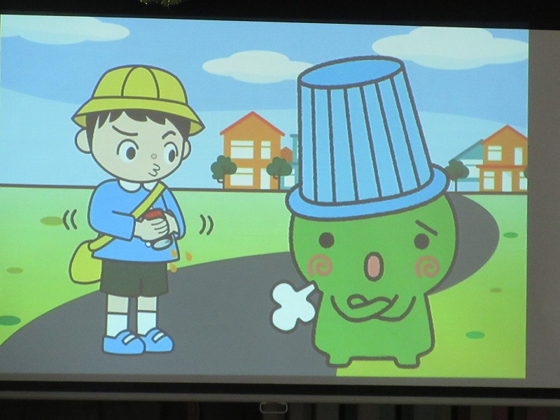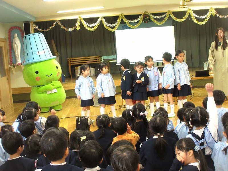 今日は堺市の環境マスコットキャラクター「ムーやん」が来て、ゴミの分別について教えてくれました。