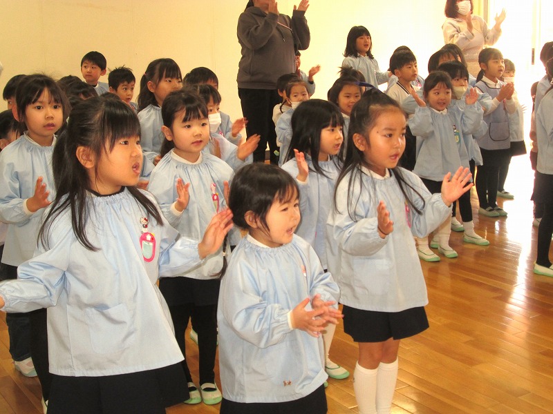 お遊戯室に集まって、みんなでお祈りをしました。今月の歌は「やさしい目が」♬