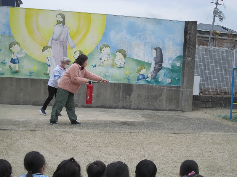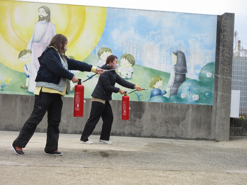 その後、先生たちは子どもたちの熱い声援を受け、消火器の訓練をがんばりました!