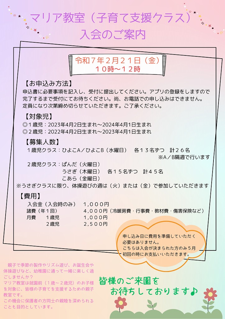 令和7年度 マリア教室(子育て支援クラス)入会申し込み時間訂正のお詫びとお知らせ