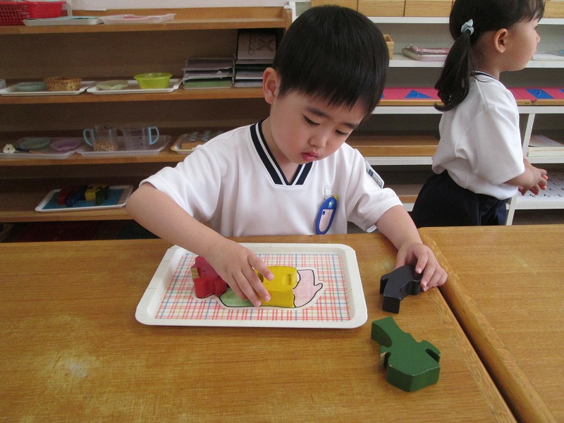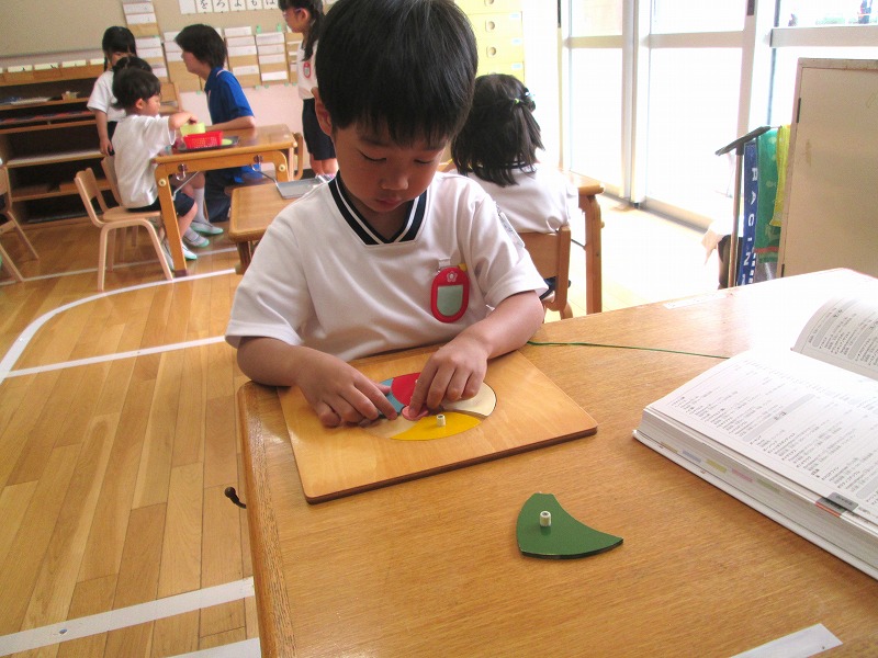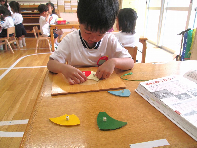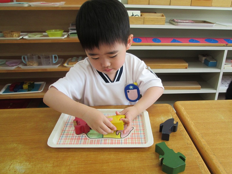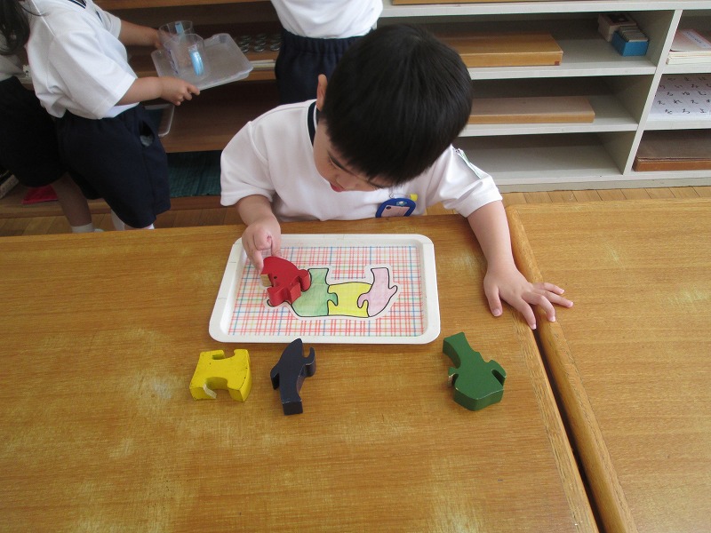 微妙に大きさの違う色鮮やかなパズルに取り組む様子