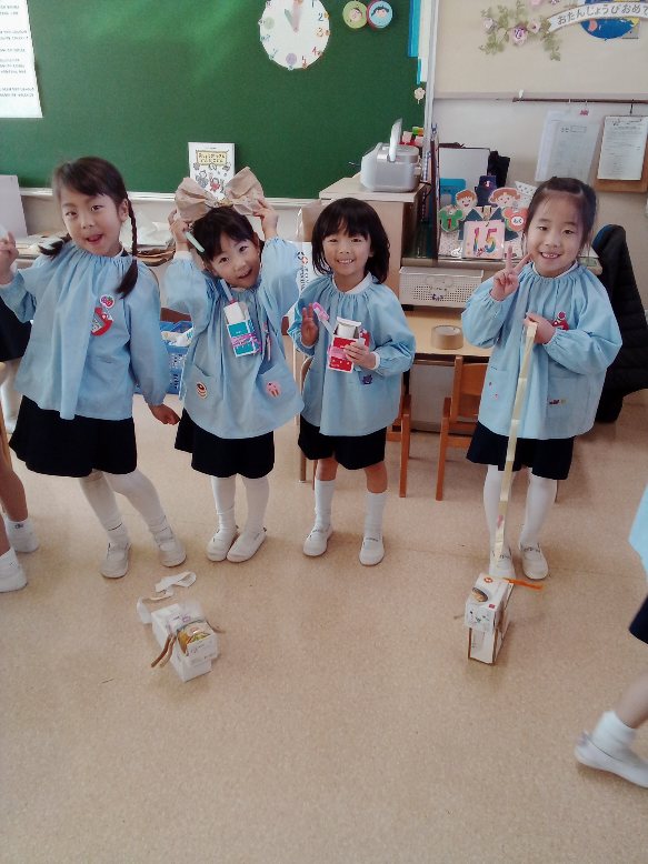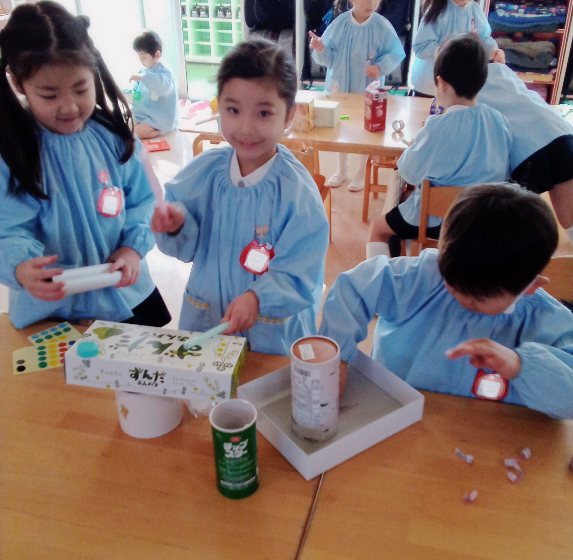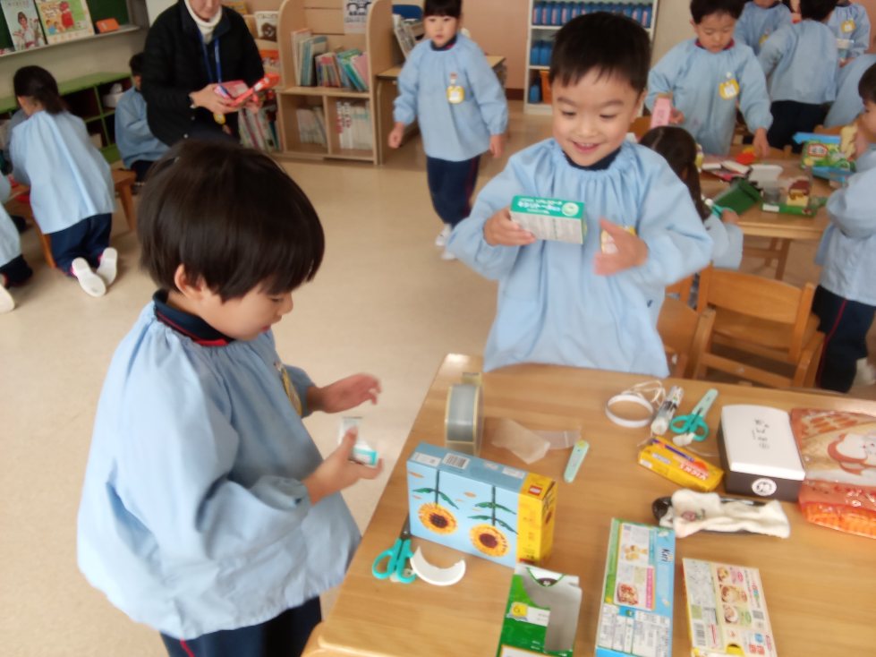 今学期に入り、空き箱や、容器などを使って、作品作りを楽しんでいます。