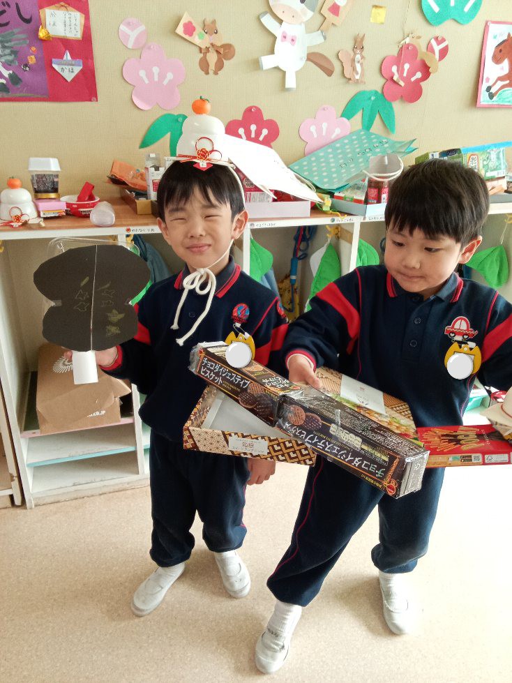 教室では、すごろくや、廃材製作。外では、鬼ごっこ遊びで、寒さに負けず走り回って体を温めています。