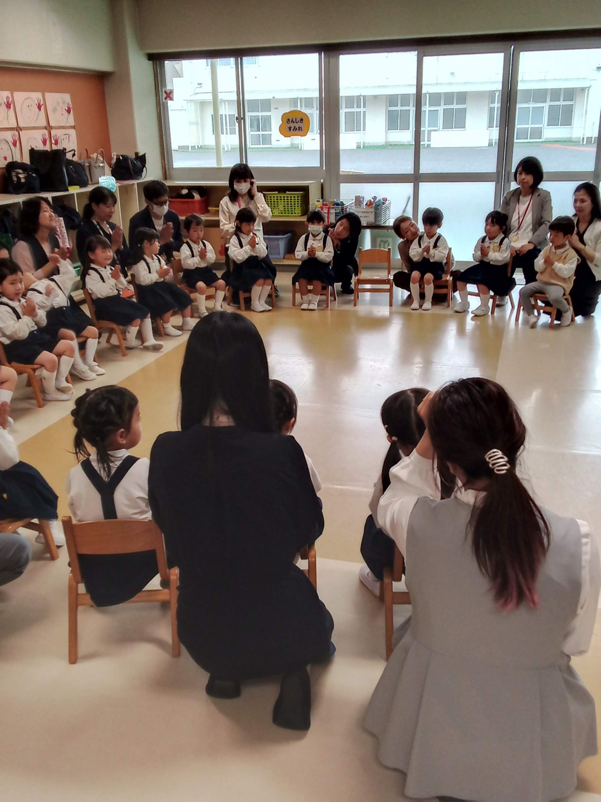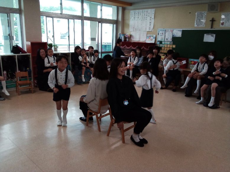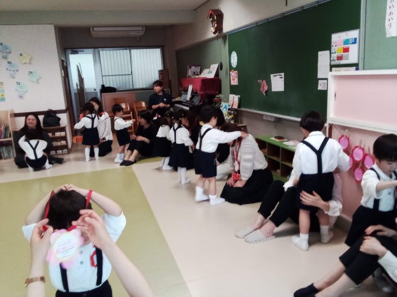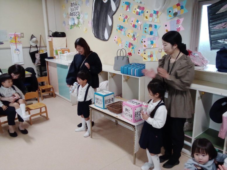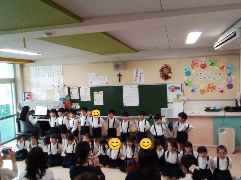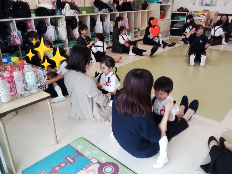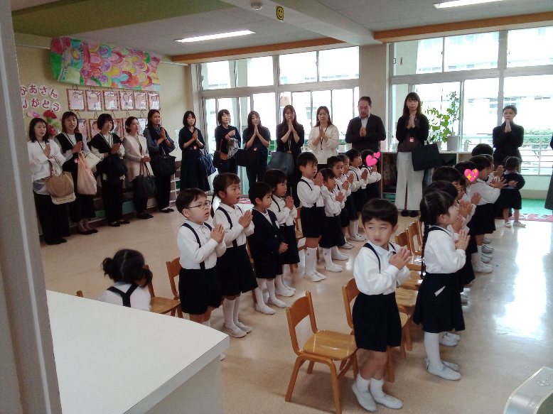 お母さんと一緒に朝のお祈りをし、園長先生のお話を聞きました。