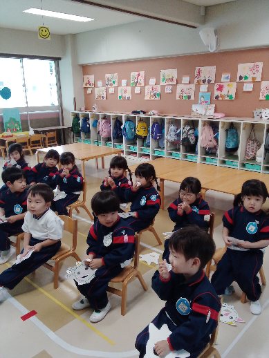はじめに、園長先生、主任先生、事務の先生、受付の先生に、手作りの首飾りを年少組からプレゼントしました。「いつもありがとうございます!」