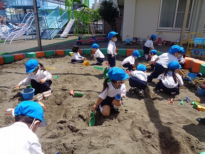 お砂場でも遊んだり、だんごむしやアリさんに夢中な子たちもいます♪