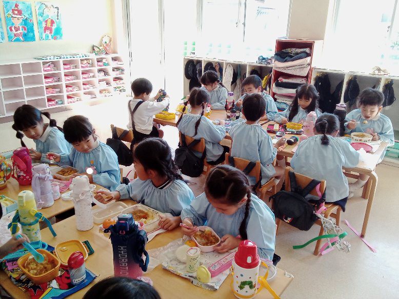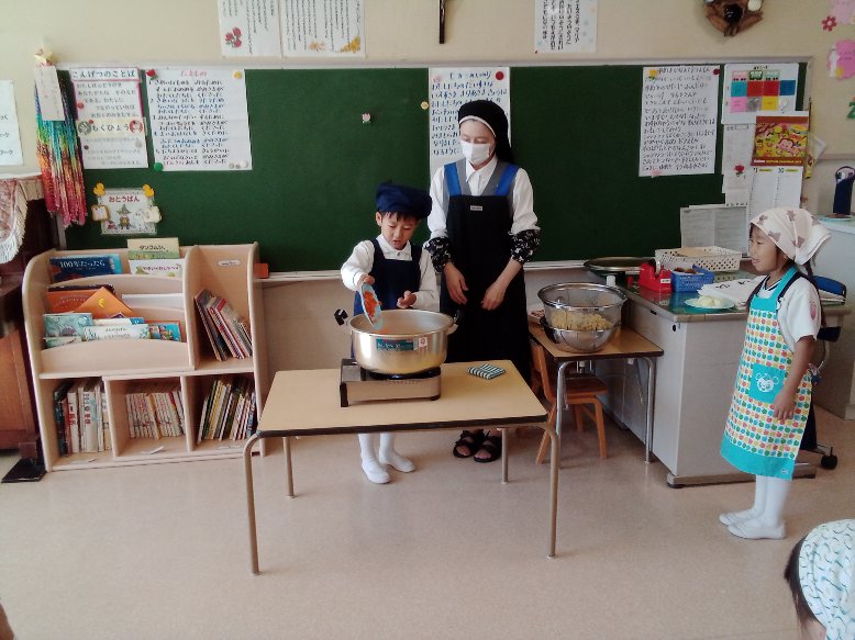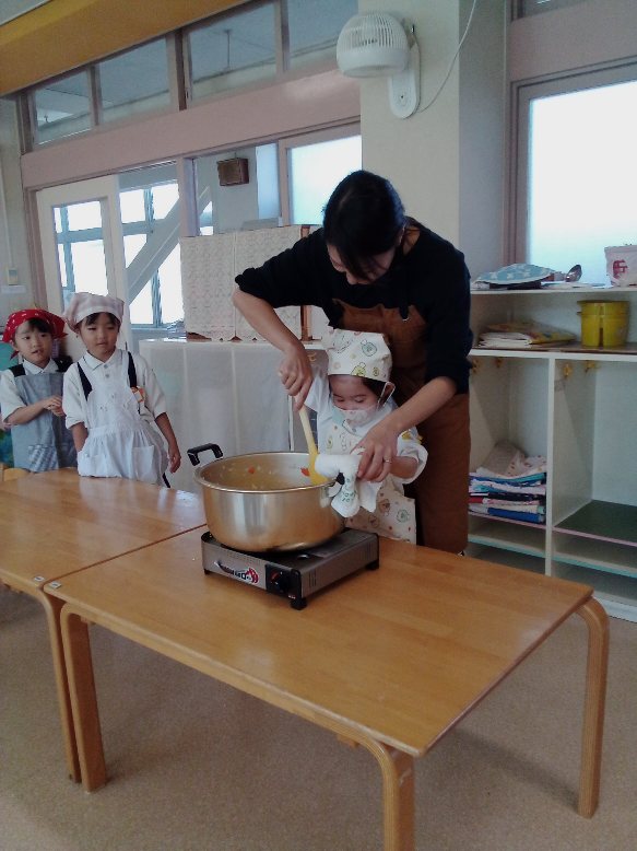「なんだか、いい匂いがしてきたなぁ」「お野菜と、お肉の色が変わってきたよ!」