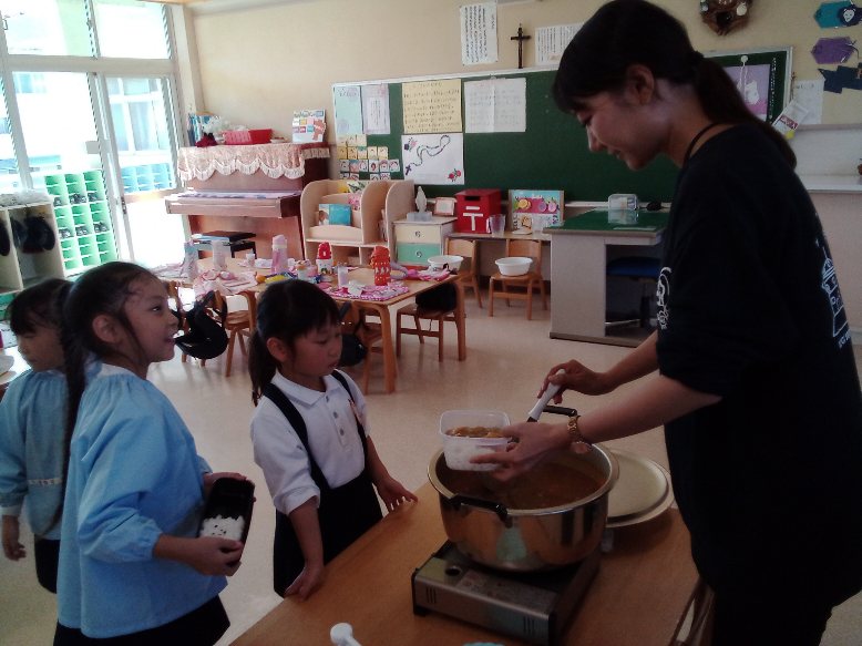 「にんじん、たまねぎ、おにくに、さつまいもを入れるよ!」