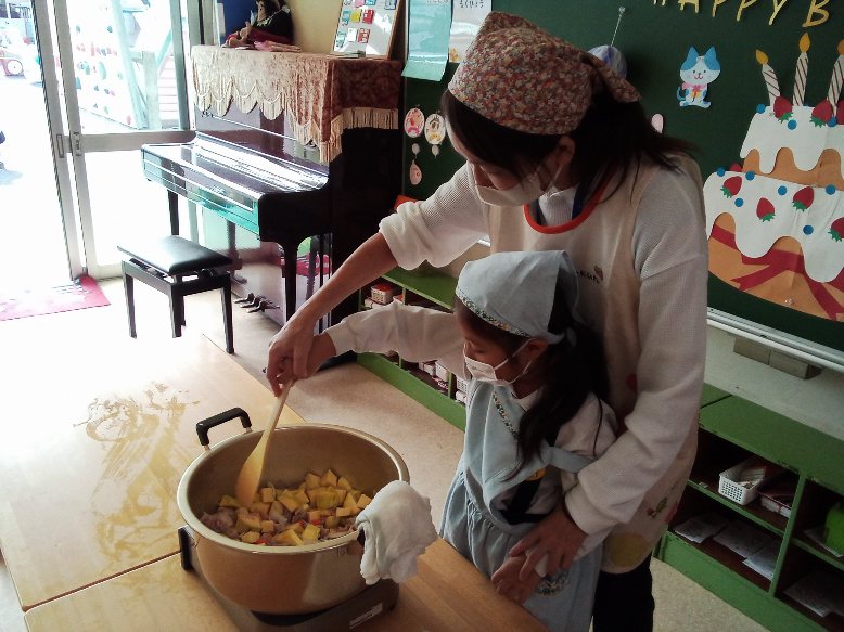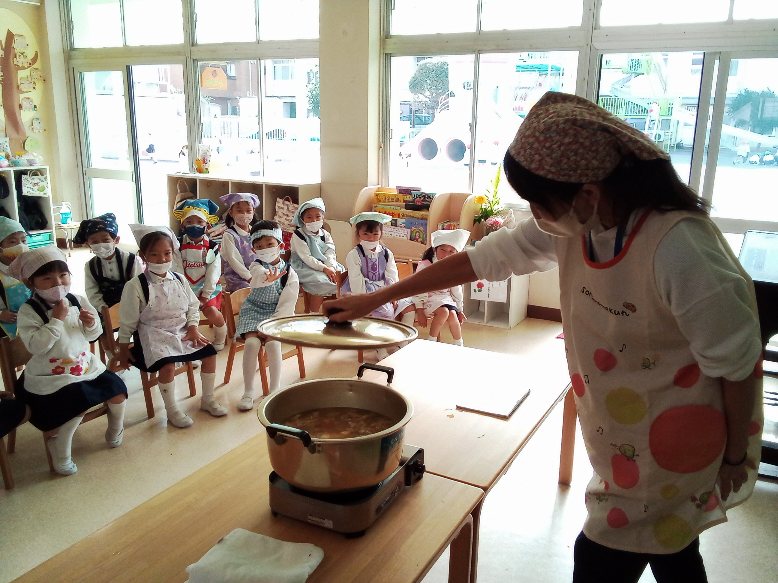 最後に、みんなで、「美味しくなーれ!」の声で、気持ちをたっぷりとお鍋に入れて、逃げないようにすぐに蓋をしました。