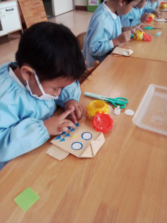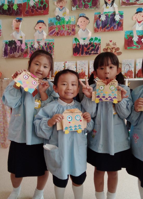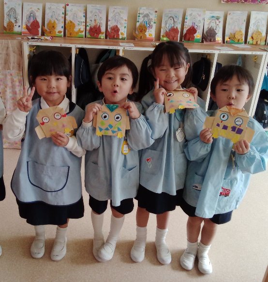 ふくろ(封筒)を使って、ふくろうを作りました。「ほーほー」