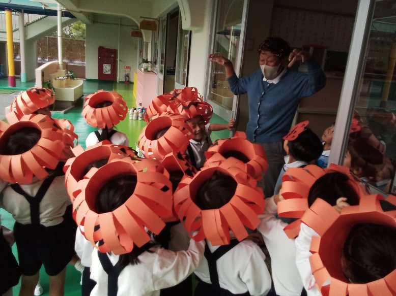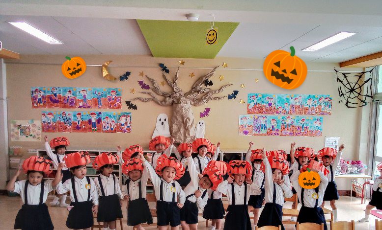 10月最後の日は、ハロウィン!かぼちゃの帽子で変装して、幼稚園を練り歩き、お化け屋敷にもチャレンジしました。