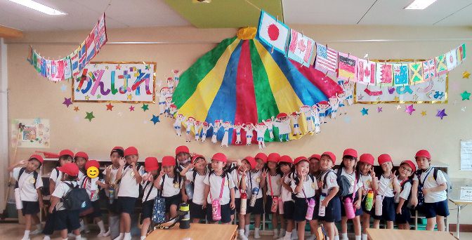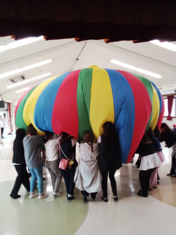 英語と鍵盤ハーモニカを参観していただき、そして最後に、保護者の皆さんにパラバルーンを体験していただきました。