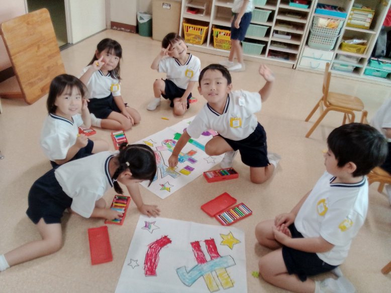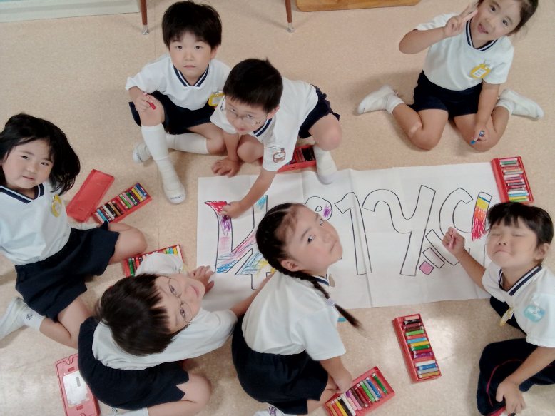 運動会では、「がんばれ!きばらぐみ」という字に色を塗って、壁面にはりました。