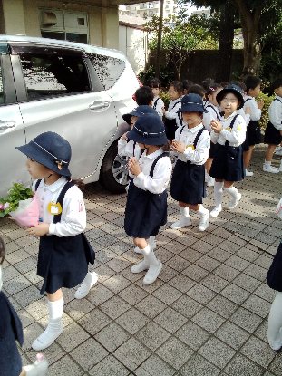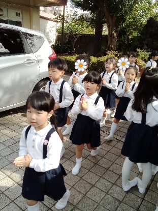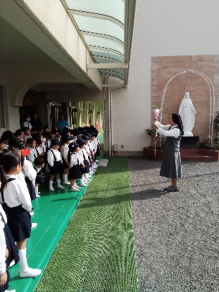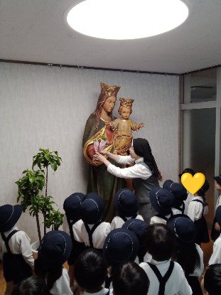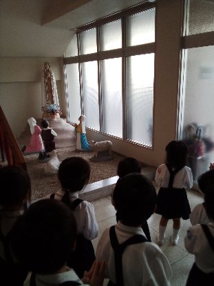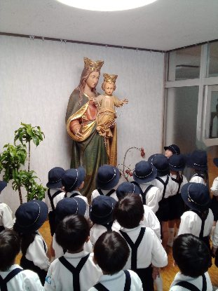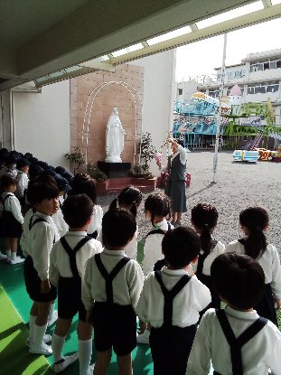 この日、ばら組全員で、アヴェ・マリアの祈りを唱えながら行列し、マリア様のご像を訪問して、祈りを捧げました。