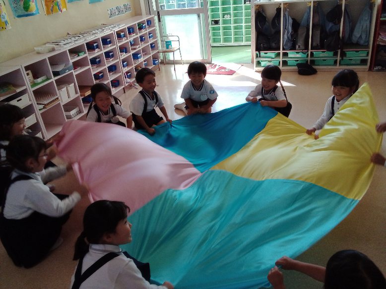パラバルーン熱はまだまだ冷めず、大きな布で、パラバルーンごっこが始まりました。