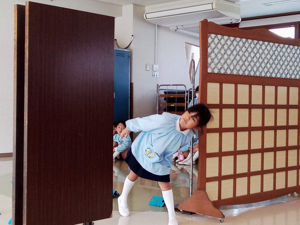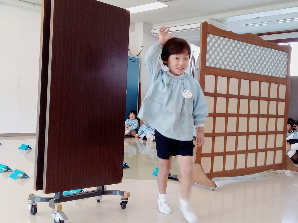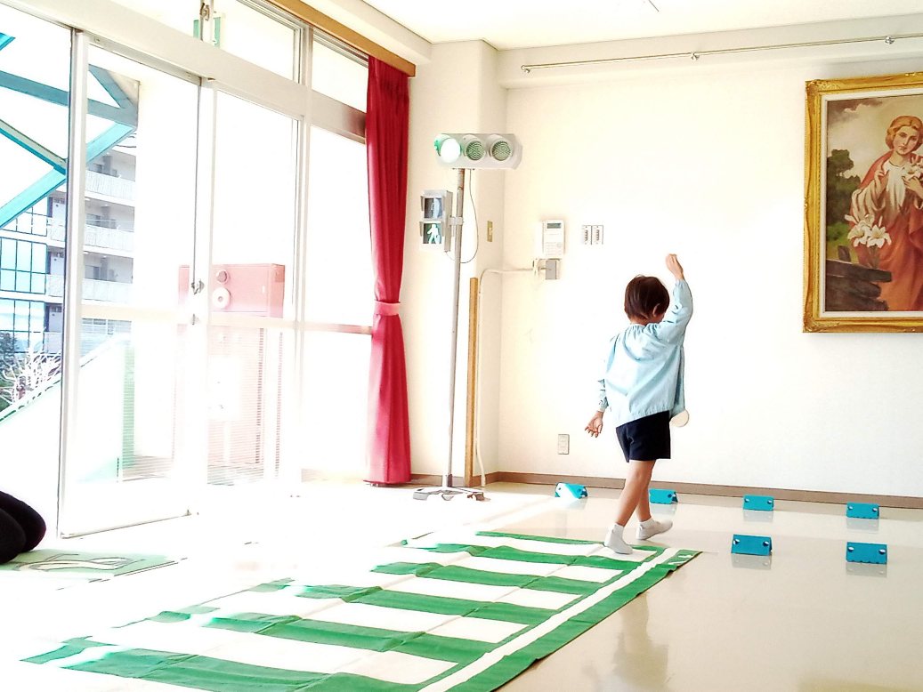 お遊戯室に横断歩道を作り、渡り方、標識についてお話を聞きます。