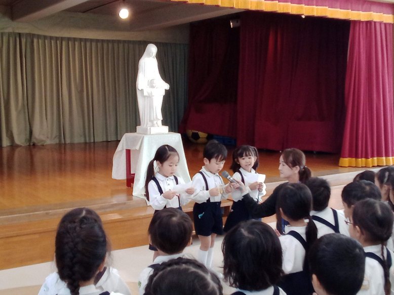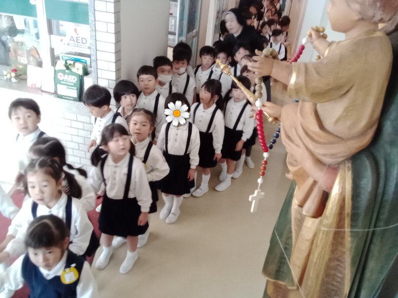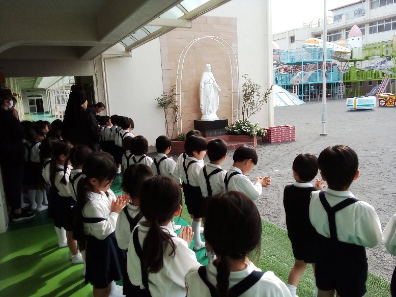 毎朝ごあいさつをしたり、園庭で遊ぶ前にもお祈りをするマリア様