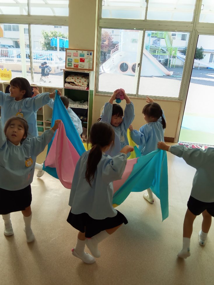 真ん中に“先生役”が入り、みんなでふわっと広げたり回したり。 笑顔がとまらない時間でした。