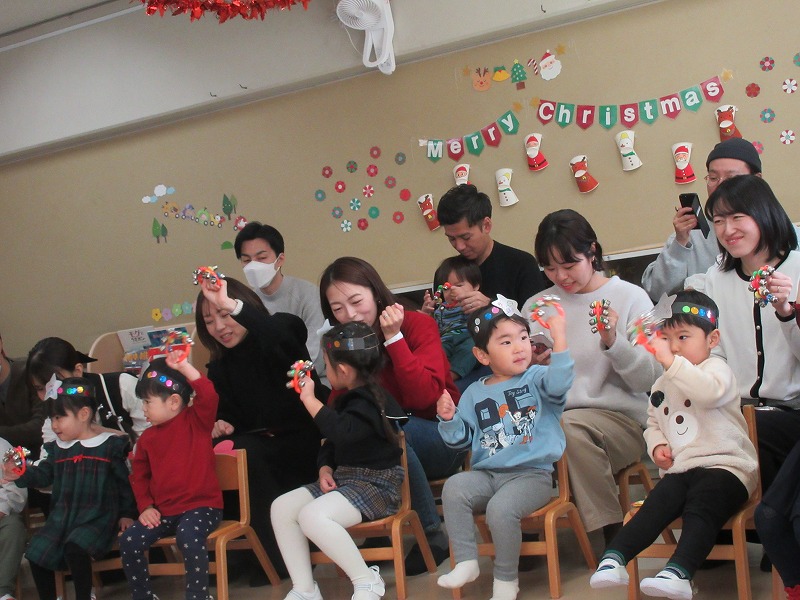 クリスマスソング「赤鼻のトナカイ」の曲に合わせて、親子で鈴を奏でたり
