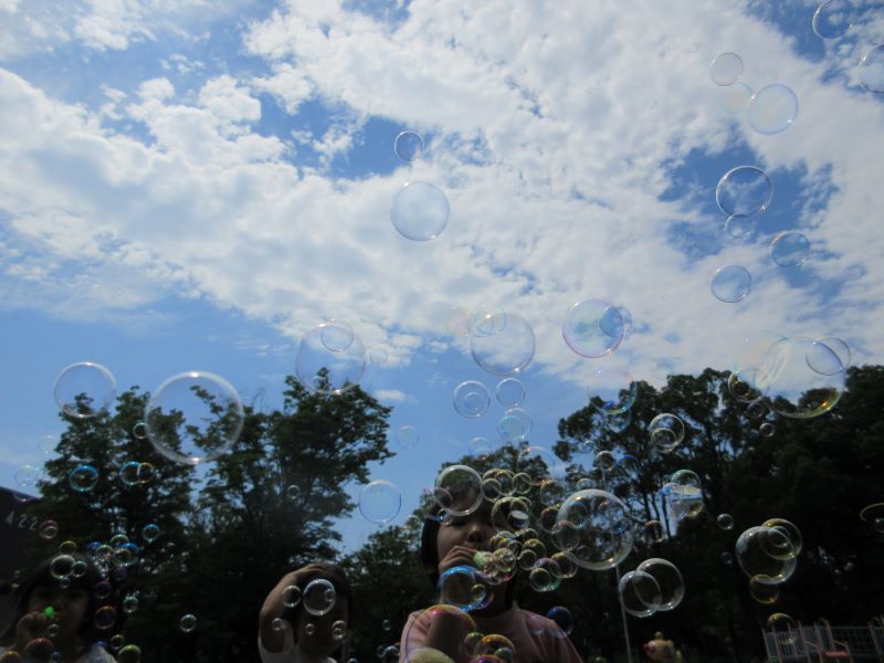 青空に飛ぶシャボン玉に一瞬、暑さを忘れることができました。