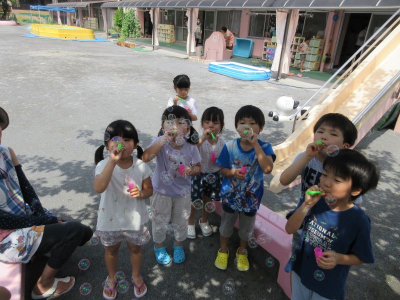 ばら組、ゆり組は外でシャボン玉遊びもしていました。