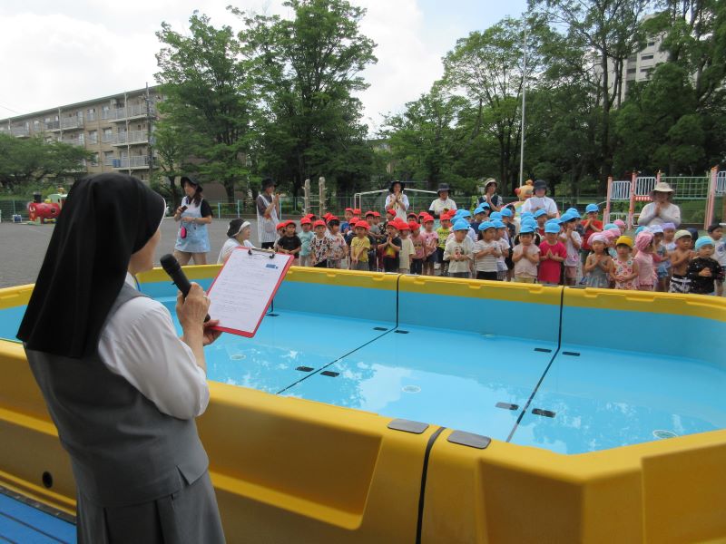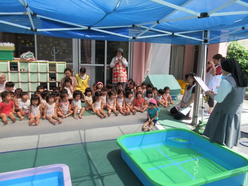 プール、水遊びができるように皆でお祈りから始めます。