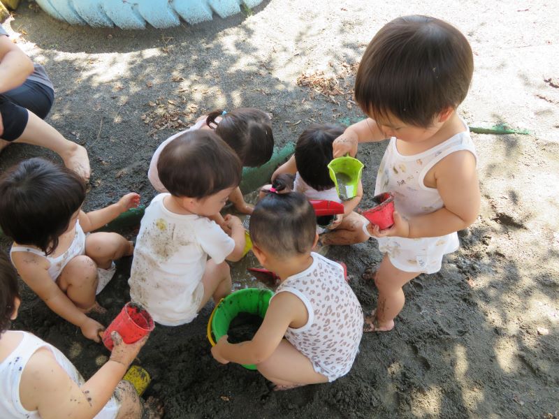 すみれ組では砂場に水を流してどろんこ遊びを楽しみました(^^♪