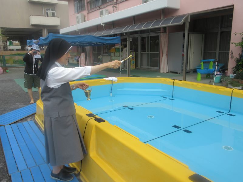 プールと子どもたちに聖水をかけてくださいました。