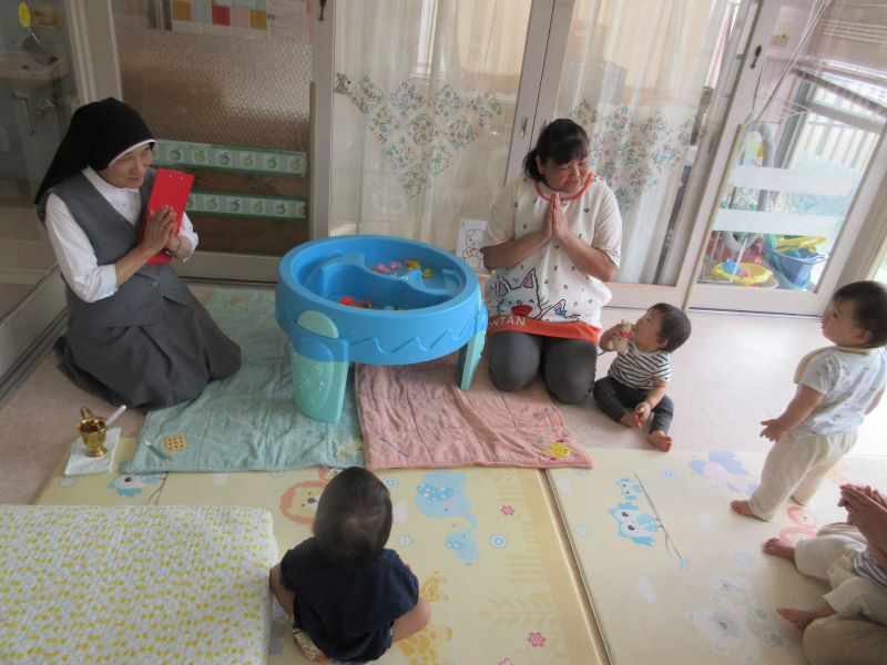 たんぽぽ組さんはお部屋でお祈り。