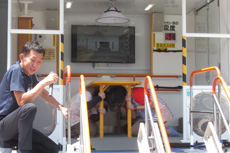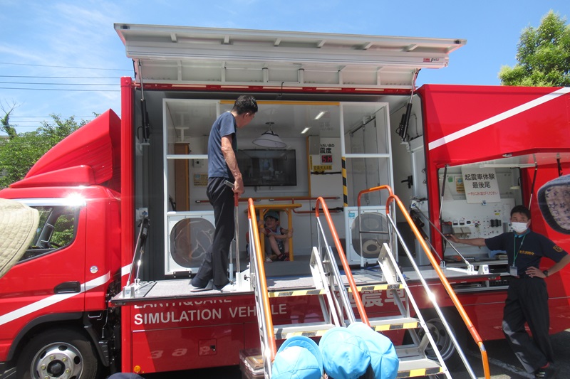 先生たちは起震車で震度7の体験をしました。