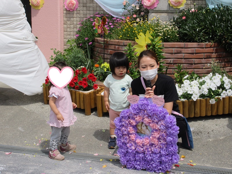 コロナ禍のため玄関のマリア様の前に集まったゆり組さん!(他のクラスは、園庭のマリア様に集合しています。)いつもと違うマリア様に「わ~!綺麗♡マリア様かわいい」と、うっとり!