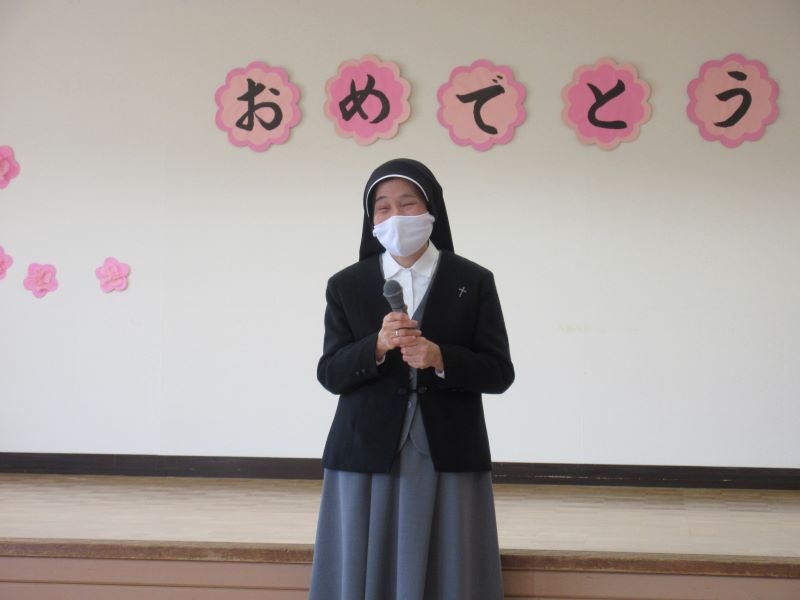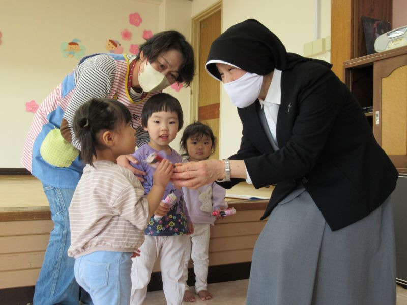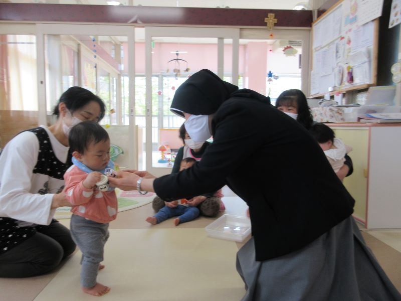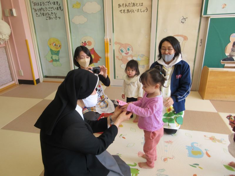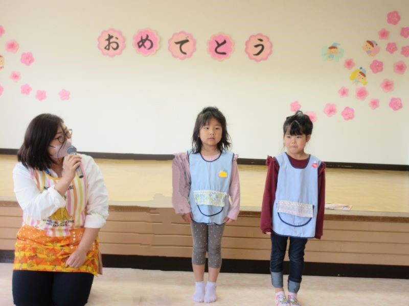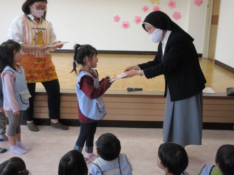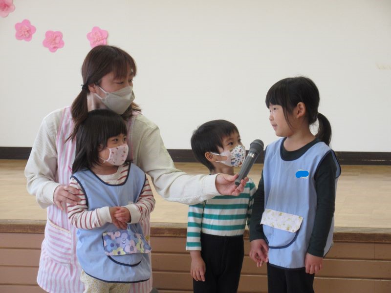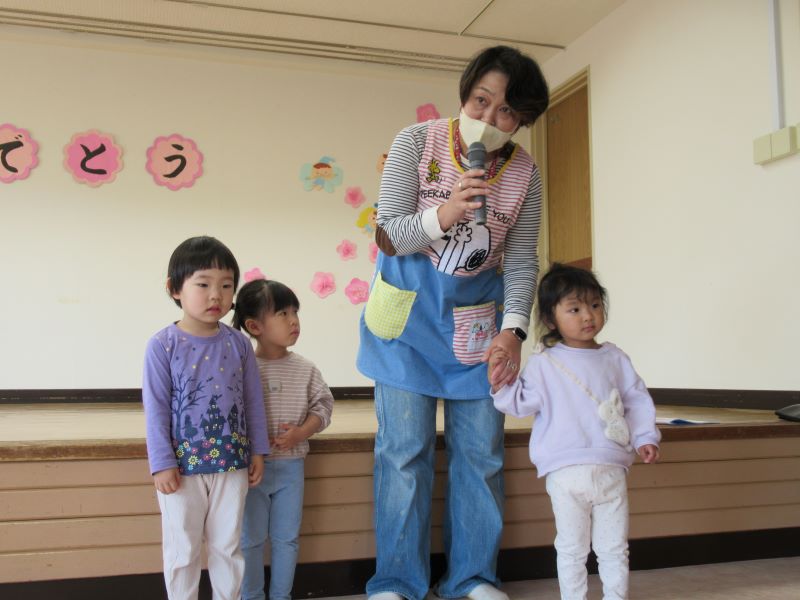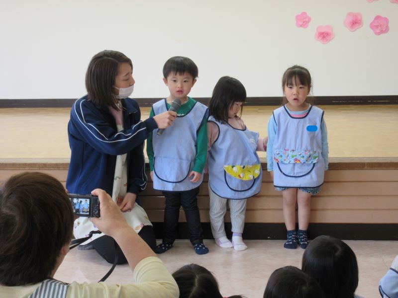 そして、ちゅうりっぷ組の子ども達から、代表の子どもが自己紹介をしてプレゼントを頂きます。