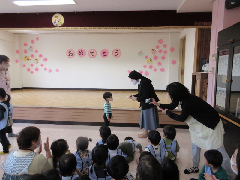 大きいクラスのお友だちです。大きいお友だちは、ホールに集まってお祝いしました。