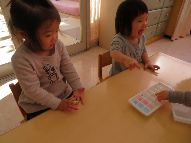 子どもたちは容器の中を興味津々でじっーと見てました。自然に出来た氷を触って「冷たいね」と感触を感じていました。
