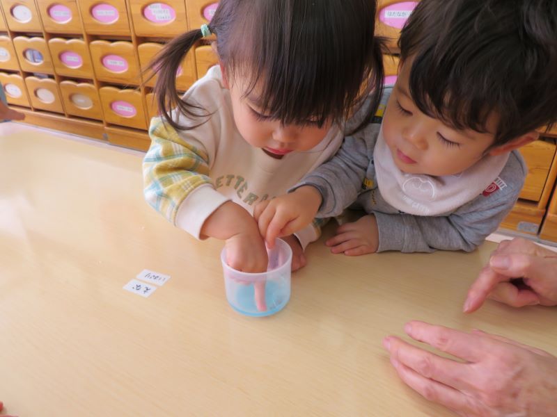今日はクラスで氷に触ってみました。前日の帰りの会で容器に入ったお水を見せて明日の朝になったらどんな風になっているかな?とお話ししました。