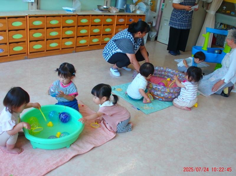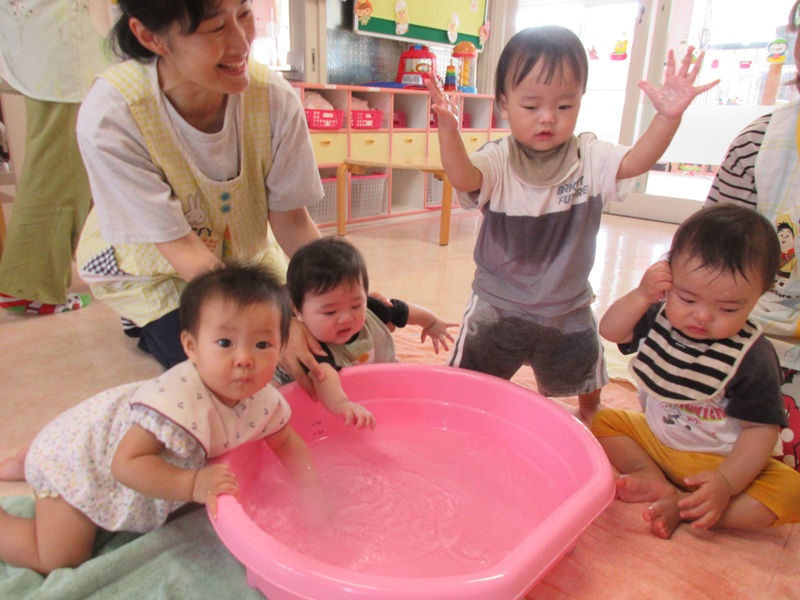 0歳児クラスはお部屋に水遊び用のたらいを置いて・・・