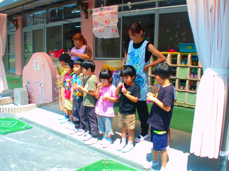 シャボン玉もやりました。みんなで「せーの!」とタイミングを合わせてシャボン玉を拭いたりして楽しそうでした。