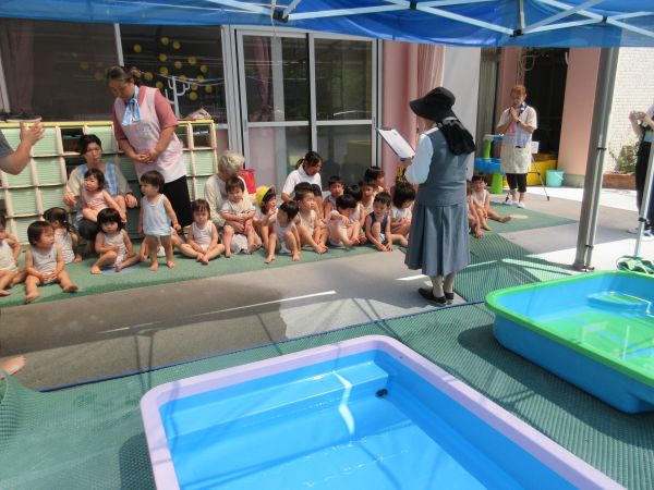 3、4、5歳児クラスは大きいプールの前でお祈りします。