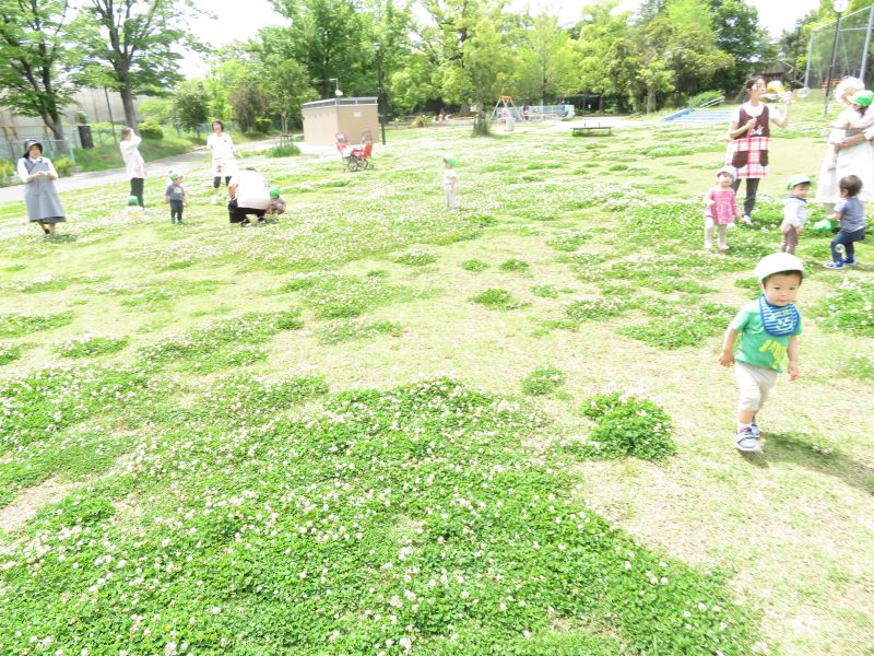 広場はシロツメ草がいっぱいでじゅうたんのようでした☆
