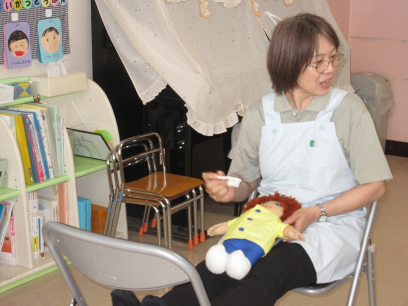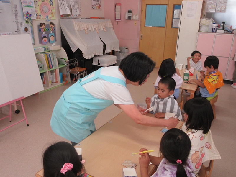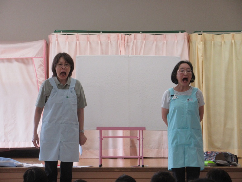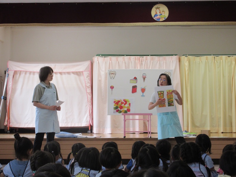 パネルシアターを使って歯磨きの大切さや歯に優しいおやつについてのお話がありました。歯磨きをしっかりとして歯を大切にしましょう。
