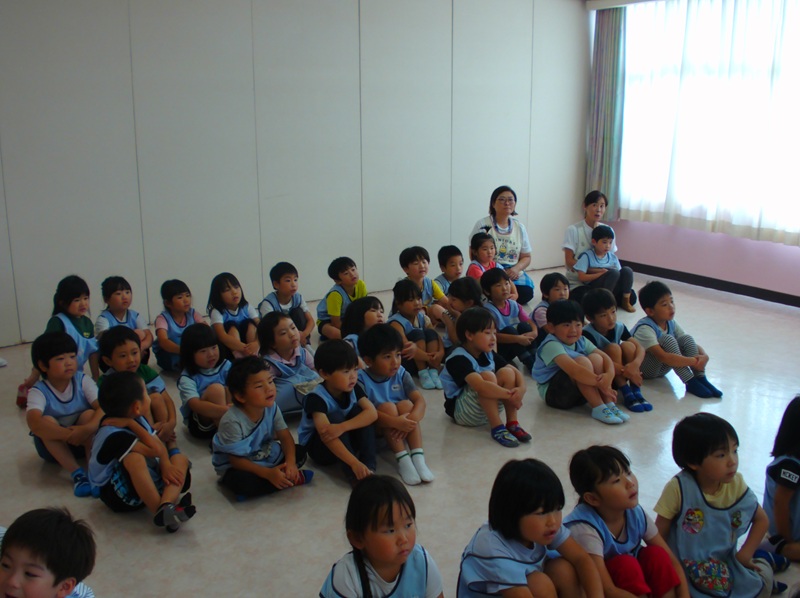 まずはホールで3.4.5歳児クラスがお話を聞きました。