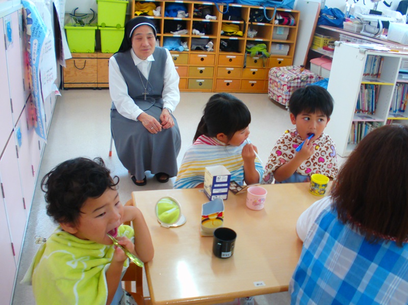 歯ブラシの持ち方も教えてもらい、鉛筆持ちで「ぴったり、かるいちからで、こちょこちょ」と歯磨きをするということで実践してみました。