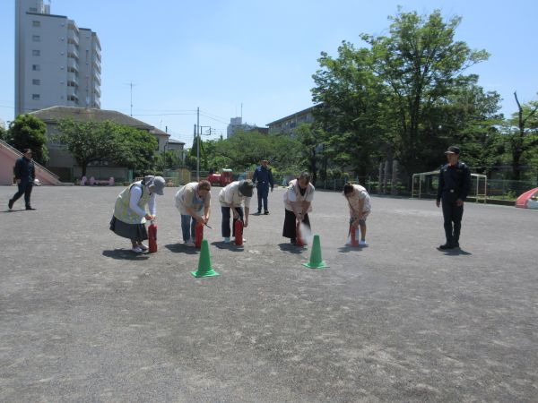 園庭に避難後は職員が模擬消火器を使った消火訓練を行いました。