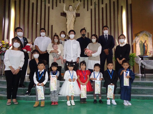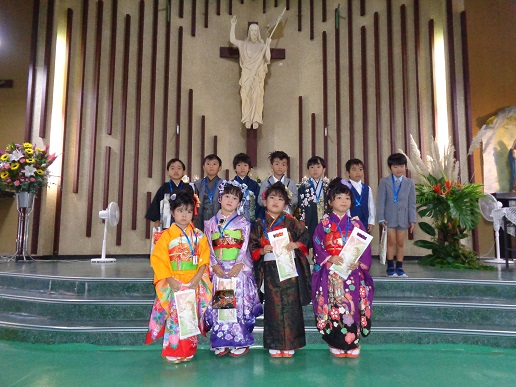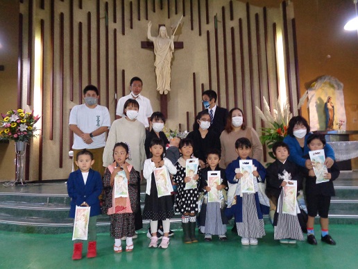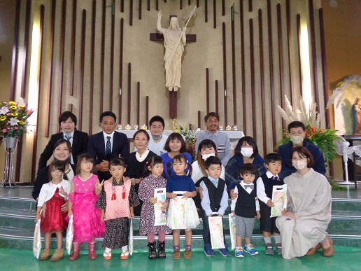 11/6(土)七五三祝福式が笠利カトリック教会で行われました。 あいにくのお天気でしたが、保護者と一緒に、素敵な格好をした子供の顔は、嬉しくて、キラキラ・(*^▽^*)ニコニコしていました。