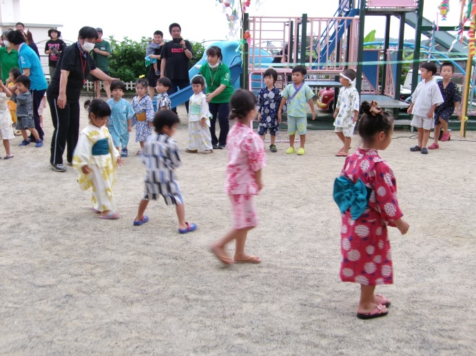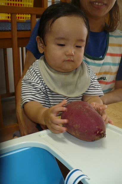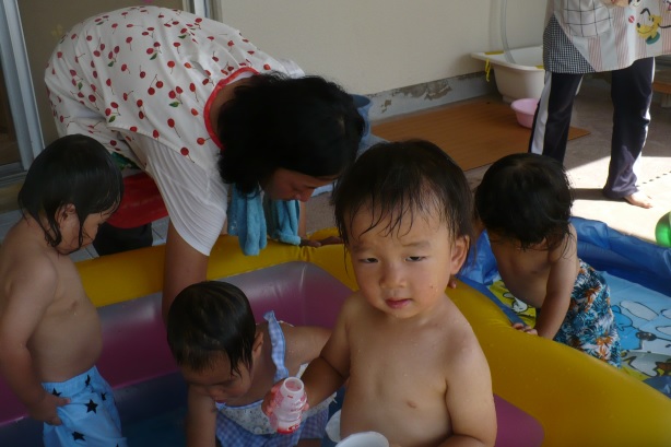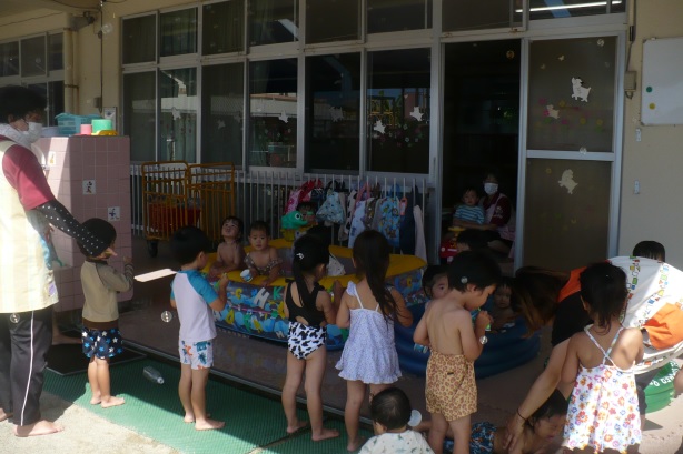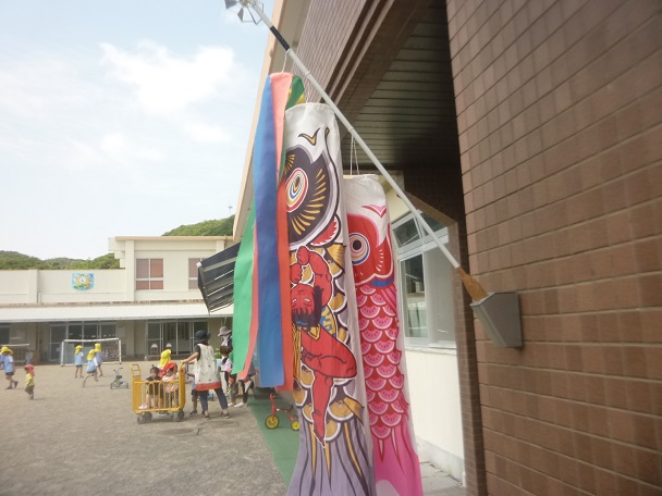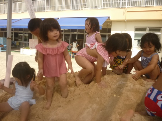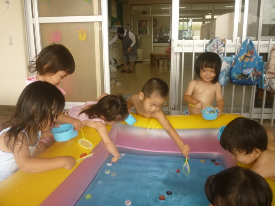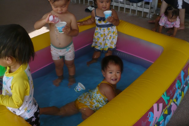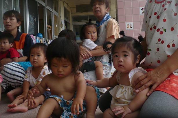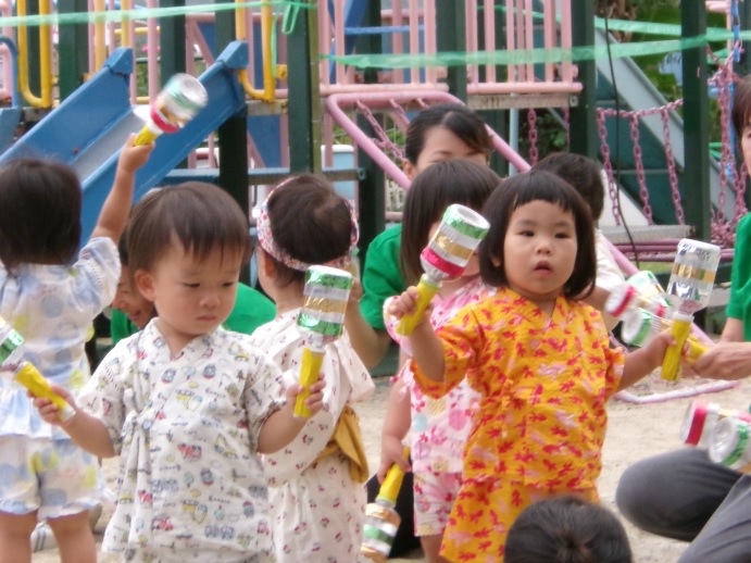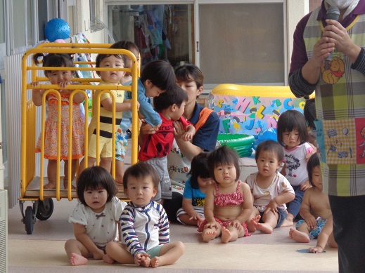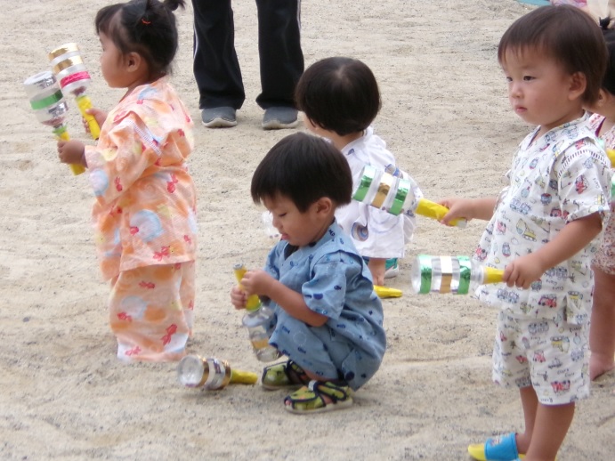 0・1才児は、荷物を引っ張って風車を取りに行くゲーム。 1才児は、ひとりで上手に引っ張り、好きな風車を選び、0才児はハイハイが上手で、とてもかわいかったです。